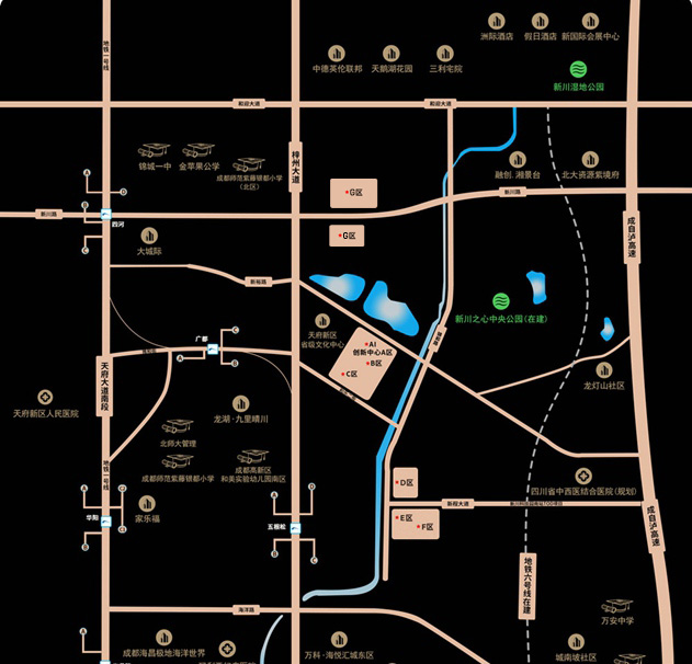 AI International Hub located in the core of Singapore-Sichuan Hi-Tech Innovation Park (Chengdu 5G Smart City), a new economic vitality zone, and adjacent to the provincial culture center Xinchuan Heartbeat Central Park,and Xinyuefu Talent Apartment. It takes less than 30min to the new and old urban centers and Chengdu Shuangliu International Airport.